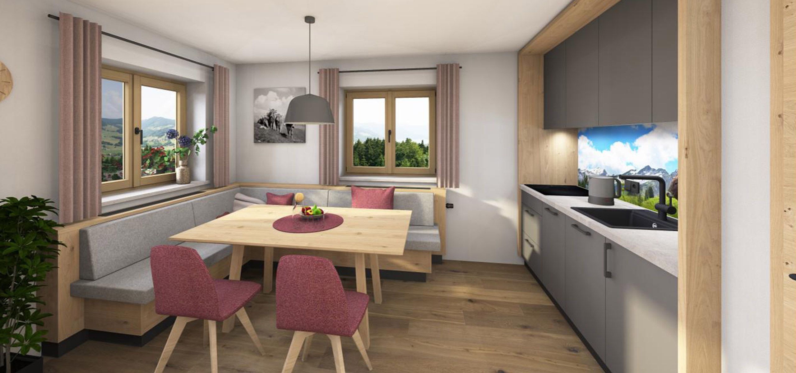 In der kleinen, gut ausgestatteten Wohnküche mit Essecke bereiten Sie sich eine herzhafte Brotzeit oder ein entspanntes Frühstück zu. Der Wohnbereich lädt zum Verweilen ein und bietet ausreichend Platz für gemeinsame Stunden.