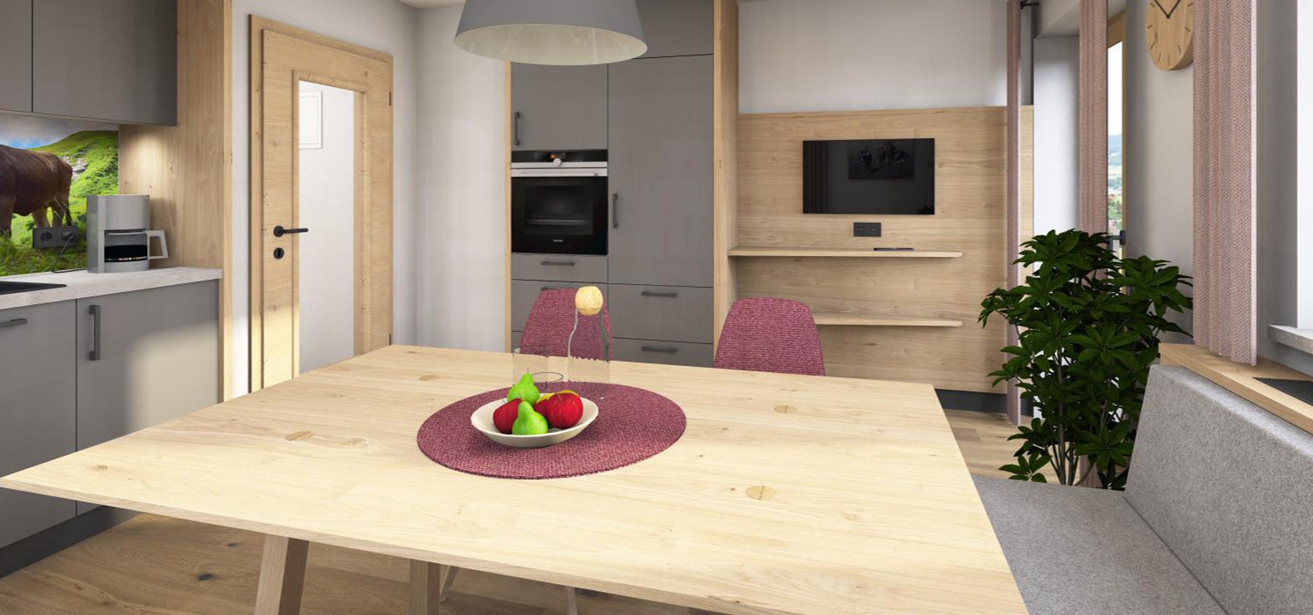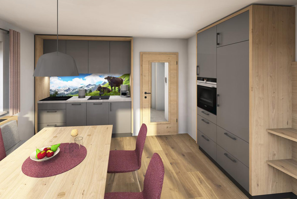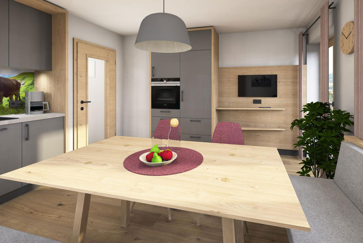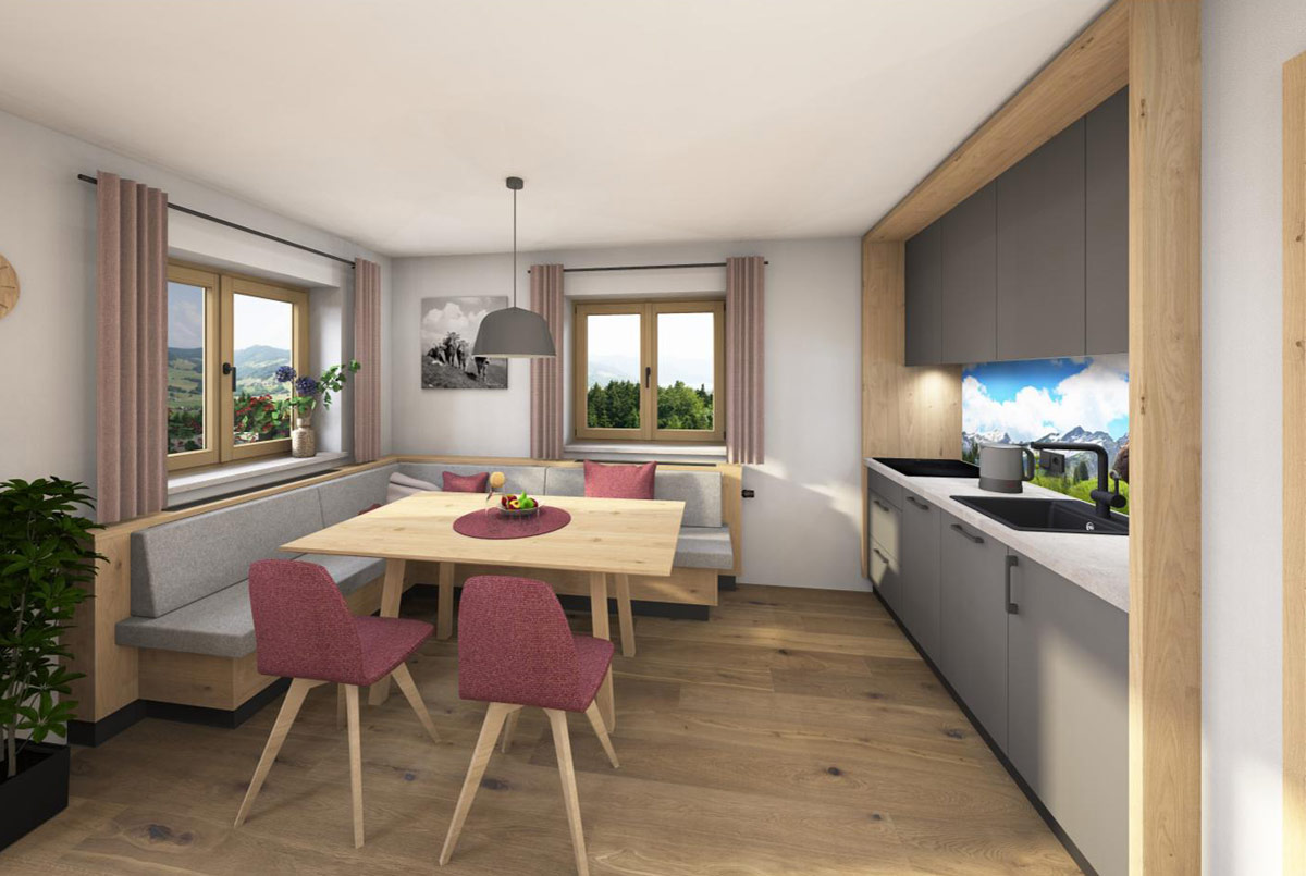 In der kleinen, gut ausgestatteten Wohnküche mit Essecke bereiten Sie sich eine herzhafte Brotzeit oder ein entspanntes Frühstück zu. Der Wohnbereich lädt zum Verweilen ein und bietet ausreichend Platz für gemeinsame Stunden.