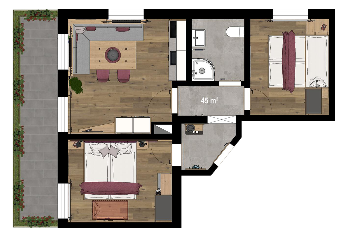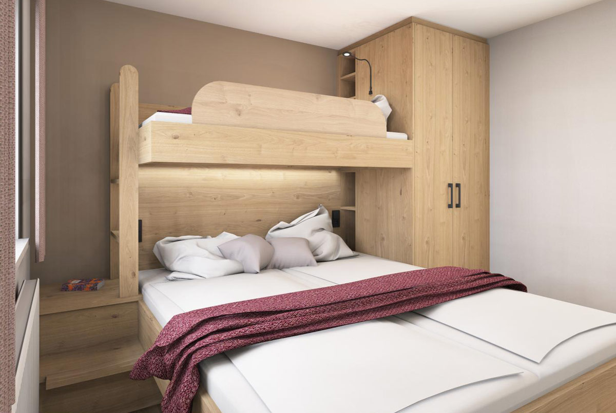 Die Wohnung verfügt über zwei gemütliche Schlafzimmer mit Doppelbett, die erholsamen Schlaf und ausreichend Rückzugsmöglichkeiten bieten. Über einem der Doppelbetten befindet sich ein zusätzliches Einzelbett, das sich besonders gut für eine fünfte Person eignet.