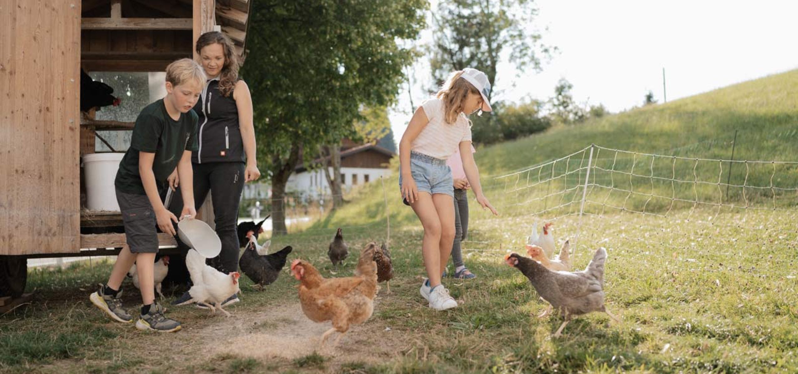 Unsere kostenlosen Extras machen den Familienurlaub auf dem Bauernhof besonders: Geführtes Reiten, morgens gemeinsam die Tiere auf die Weide bringen und abends in den Stall begleiten, Tiere streicheln und füttern. Die kleinen Helfer dürfen im Stall mit anpacken und – wenn sich die Gelegenheit bietet – sogar auf dem Traktor mitfahren. Unsere Rinder, Schafe, Pferde, Esel, Hasen, Katzen, Ziegen und Hühner freuen sich schon auf viele Streicheleinheiten.